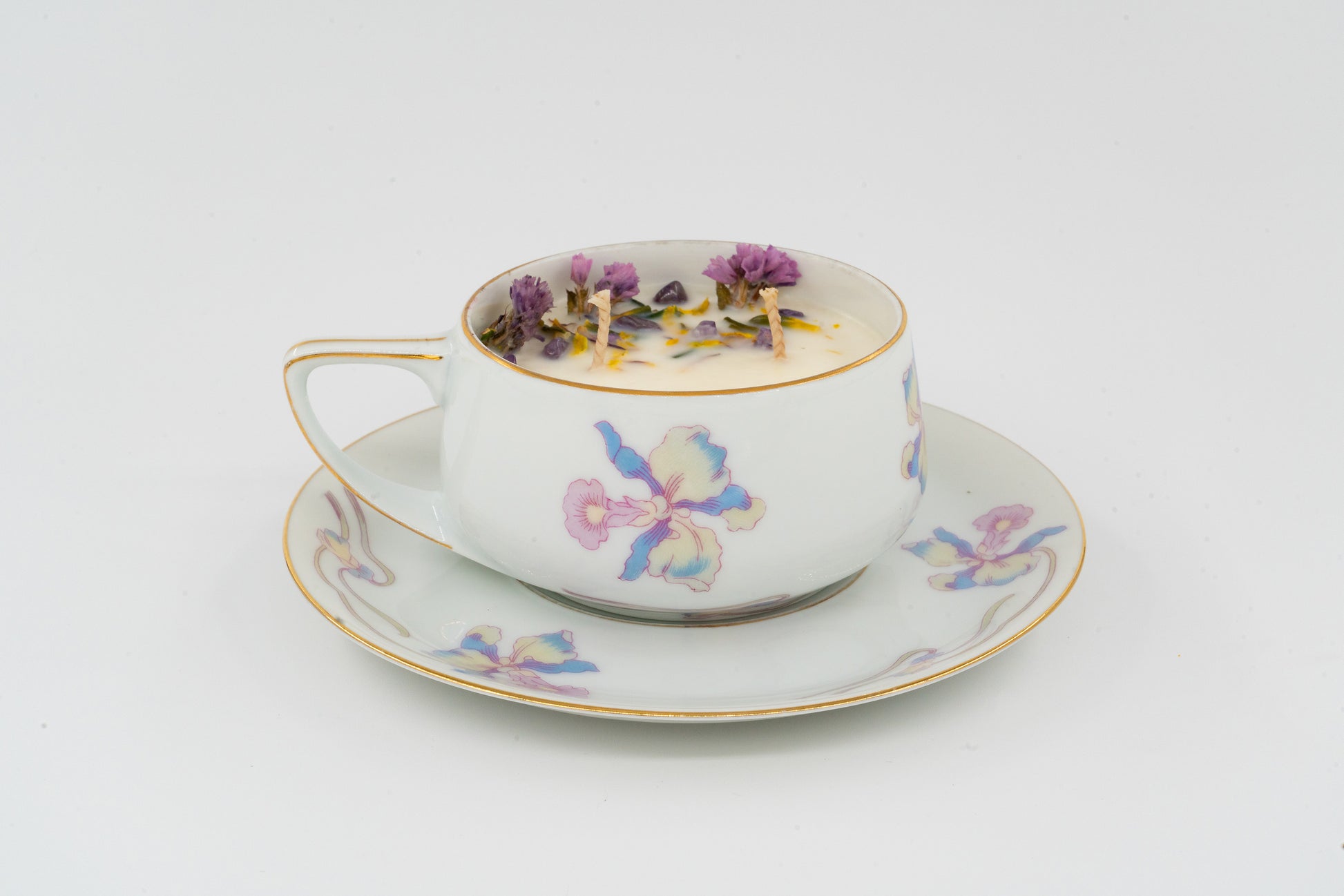 Vintage Ceramic bone china cup and saucer, by Bohemia Ceramic, made in Czechoslovakia. Precious pink, blue, and purple irises with gold trim. Pattern Donatello #776