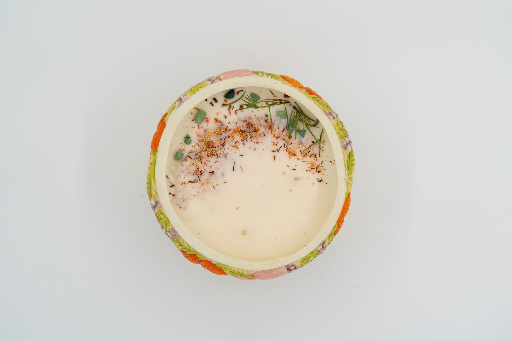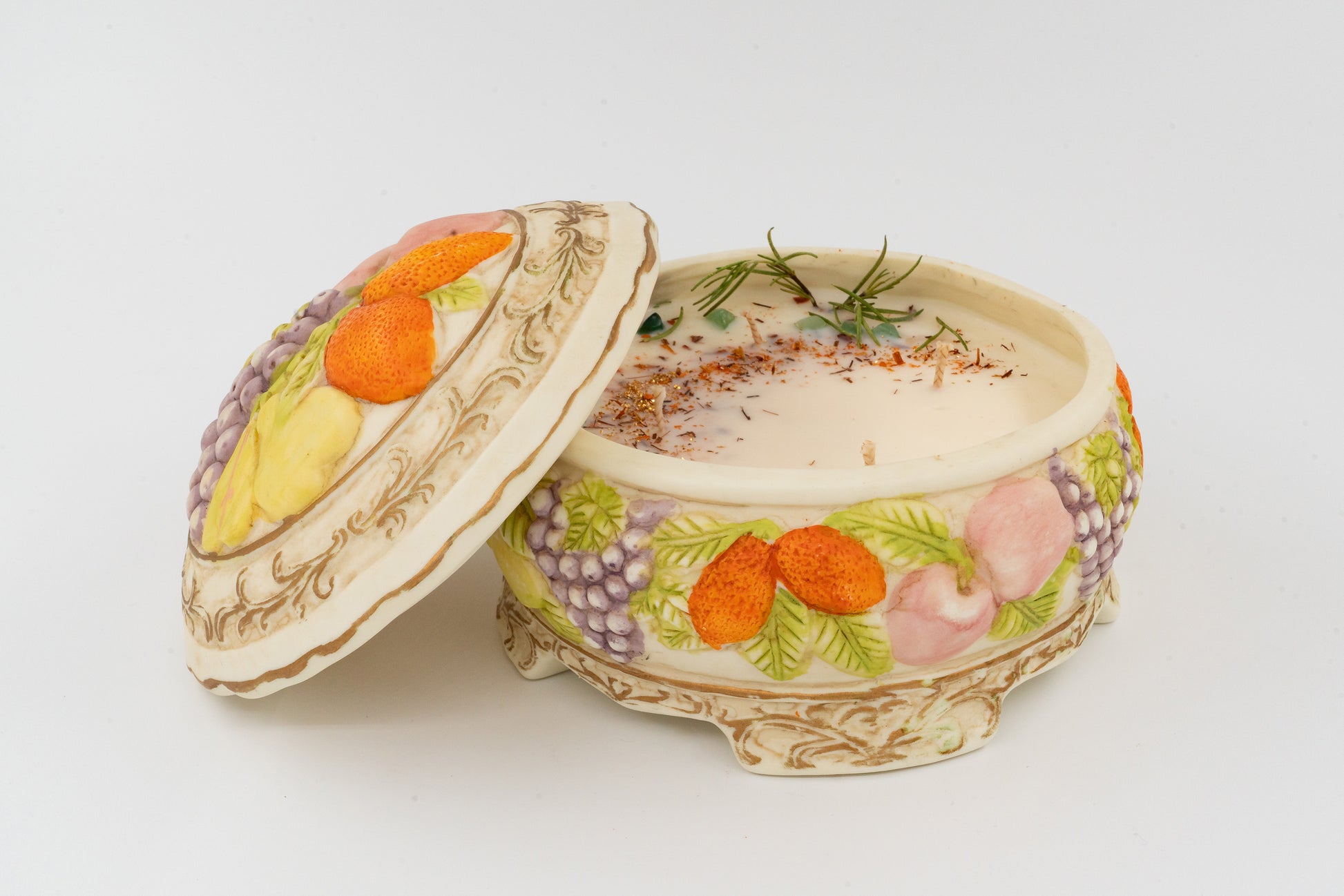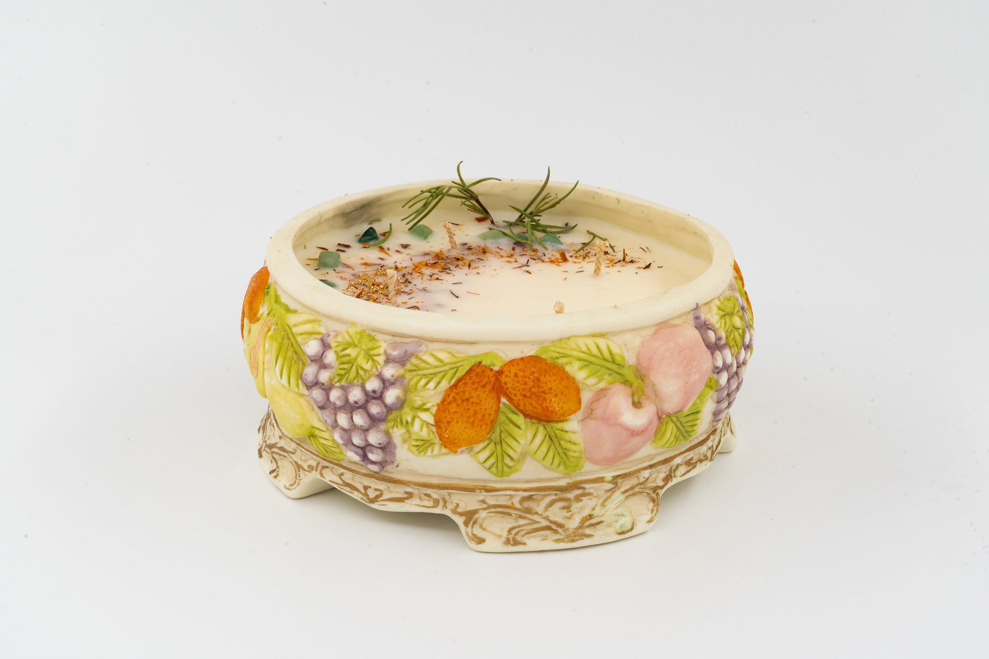 Embark on a journey of tranquility with our meticulously crafted candle, a blend of Coconut-Soy wax and the soothing scent of Baked Apple. Housed in a lidded porcelain candy dish embellished with hand painted fruits and filigree, this candle is crafted to enhance your space and healing practices. Elevate your space with ancient energy and delightful aromas, creating a haven of peace and mindful moments.