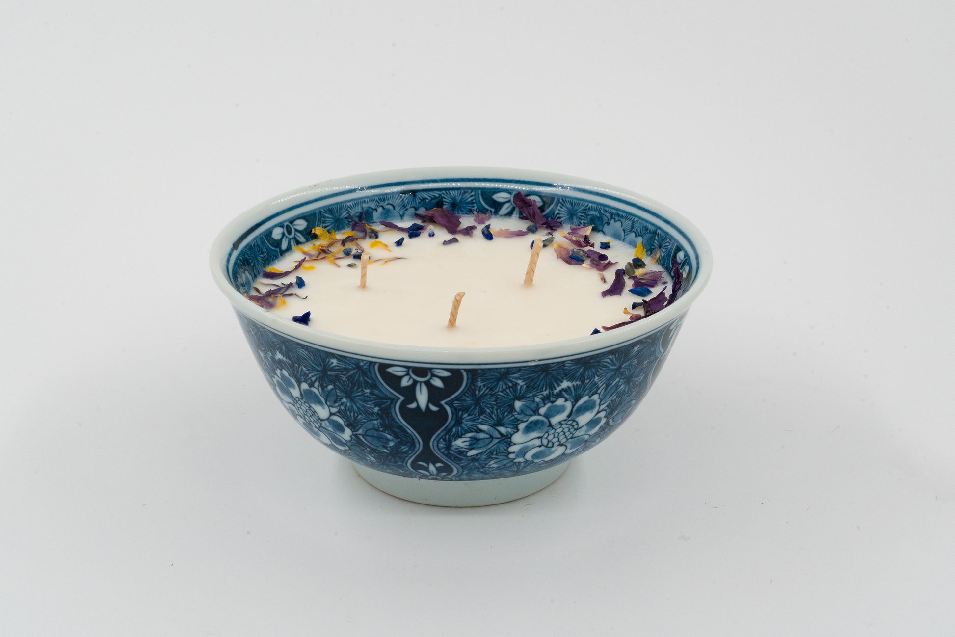Vessel: Vintage Japanese blue and white cherry blossom porcelain rice bowl. Approx 6" in diameter and 3" tall. This beautiful bowl features cherry trees, peony and chrysanthemum trees.