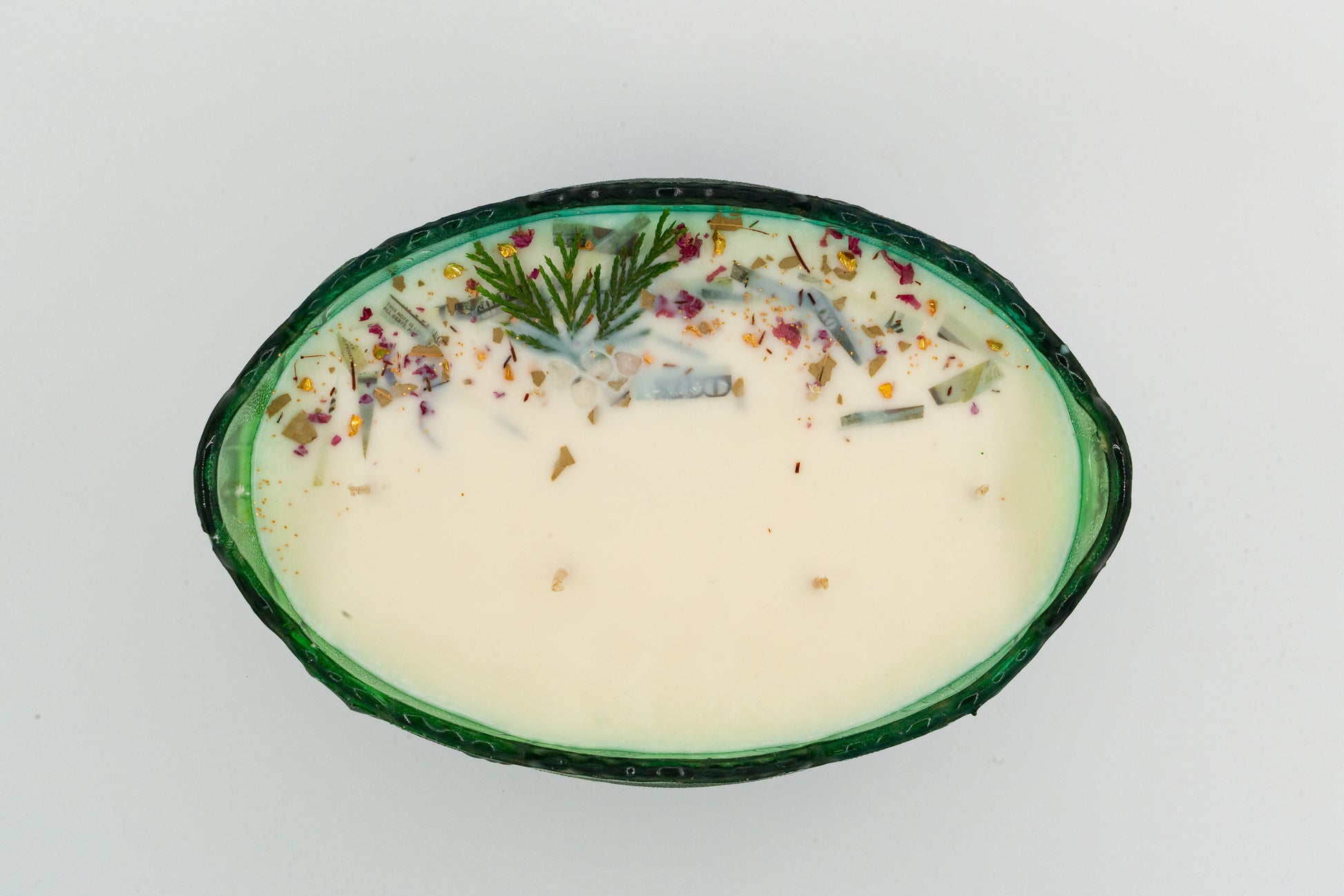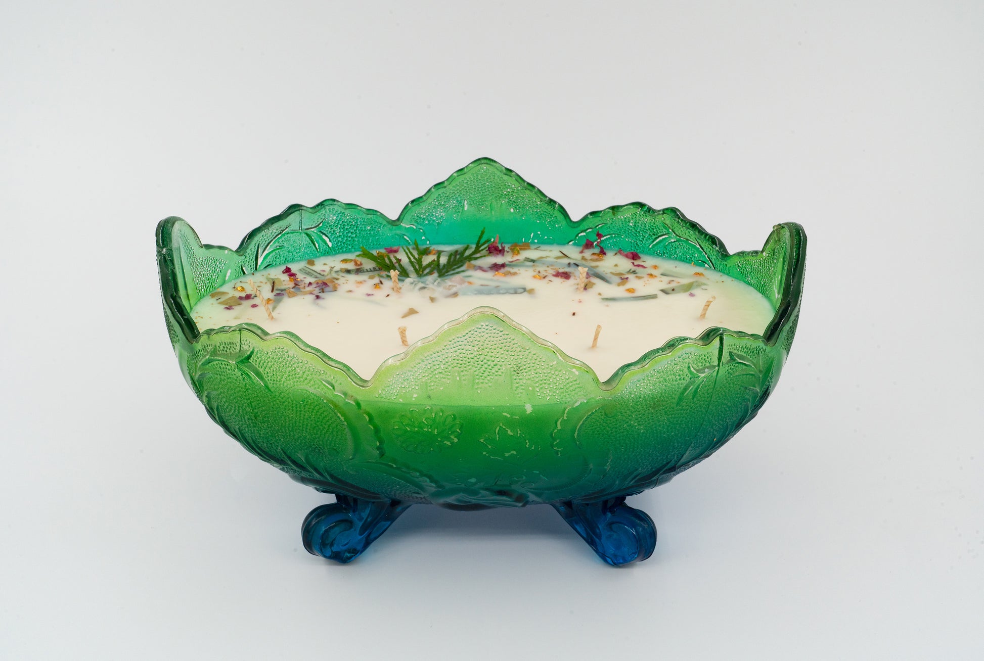Experience the joy of the holidays with our exclusive "Ocean Harmony" candle. This hand-poured Coconut-Soy wax blend will add Reiki love and relaxation to your space and rituals. Fill your space with the inviting scent of Holiday Cheer, transporting you to the spirit of celebrations. Our Jeanette Lombardi footed glass fruit bowl is an elegant ombre design of green to blue tones with a delicate leafy pattern—truly a work of art. The perfect accompaniment to the festive season's cheer.
