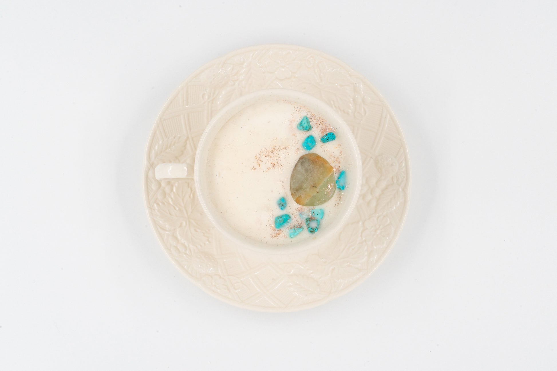 Adornments: Large moonstone crystal, Turquoise, and gold glitter.